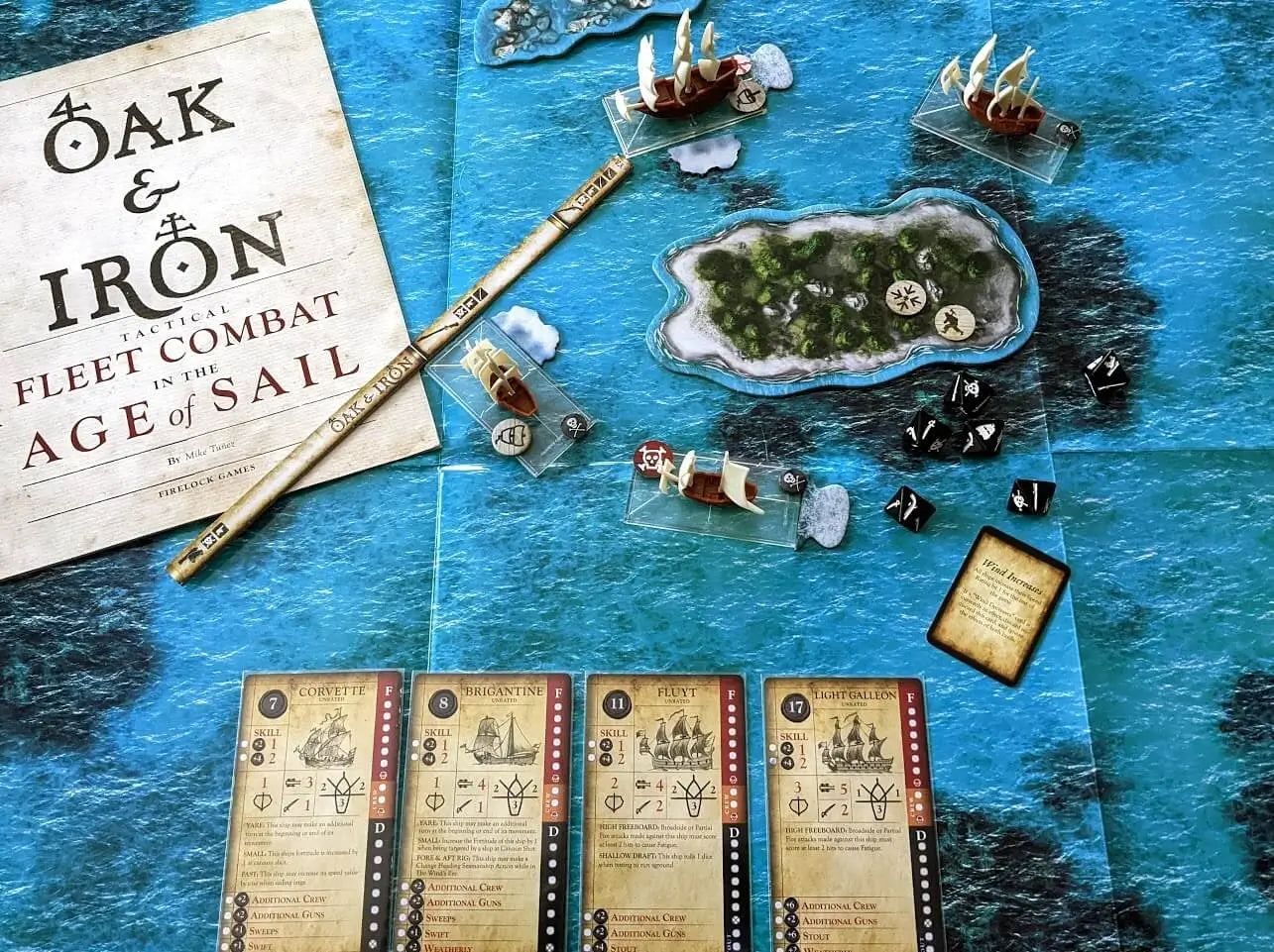 Oak & Iron is a 1/600th scale naval game set in the age of piracy, imperial expansion, and above all, fighting sail. It allows players to recreate battles between small fleets and squadrons of armed sailing ships. The game is designed to be simple and intuitive while also challenging players by providing significant tactical depth, being true to the theme and tactics of the period, and supplying significant flavor for the various factions represented in the game.